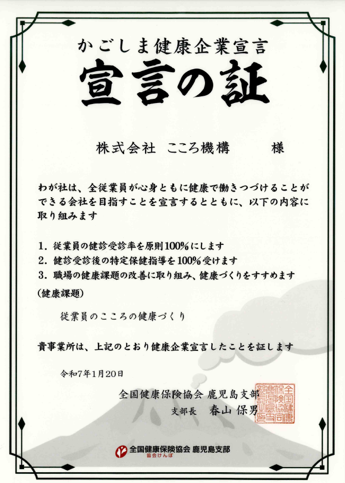 こころ機構は、職員の健康づくりや健康経営を目指し、「かごしま健康企業宣言」にて、下記項目を宣言いたしました。